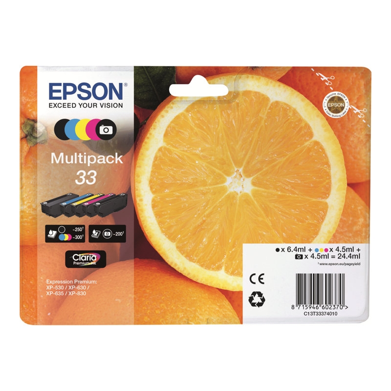 | Descripción del producto | Epson 33 Multipack - paquete de 5 - negro, amarillo, cián, magenta, Photo Negro - original - cartucho de tinta |